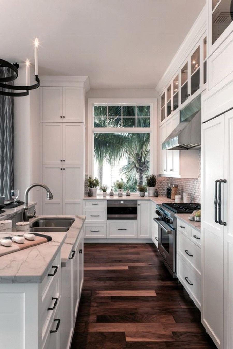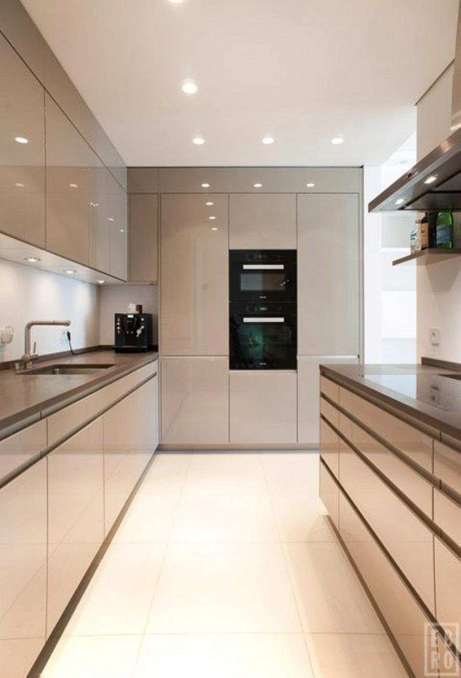 Branco, bege e tons neutros são muito usados nas cozinhas desse estilo, bem como espelhos e vidros espelhados, mármores ou porcelanatos marmorizados e polidos, marcenaria e bancadas muitas vezes com acabamento brilhante.